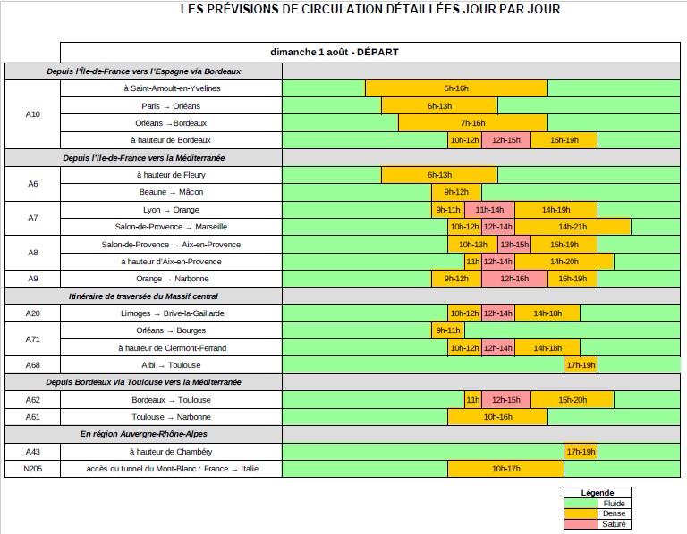 Samedi 31 juillet sera la journée classée Noir cet été. Il correspond au traditionnel chassé-croisé entre les « juilletistes » et les « aoûtiens ». Dans le sens des départs, la circulation sera « extrêmement difficile » sur la grande majorité des axes routiers et dans le sens des retours, la circulation sera très difficile plus particulièrement dans la région Auvergne-Rhône-Alpes et sur l’Arc méditerranéen. À noter que durant toute la période, dans le sens des départs, des difficultés de circulation sont attendues, notamment sur les autoroutes A6, A7, A8 et A9, dans le Sud-Est et sur l’Arc méditerranéen, sur l’A20, A61, A62 et A63 dans le Sud-Ouest. Des difficultés de circulation sont également attendues vers le Grand-Ouest, sur l’autoroute A10. Dans le sens des retours, la circulation sera dense et bien souvent difficile dans le Sud-Ouest sur les autoroutes A61 et A62, en Auvergne-Rhône-Alpes sur l’autoroute A7 et sur l’arc méditerranéen entre l’Italie et l’Espagne, que ce soit dans le sens Est-Ouest ou dans le sens Ouest-Est, sur les autoroutes A8, A7, A54, A9, sur la côte de la frontière italienne jusqu’à la frontière espagnole sur l’autoroute A9. Il est donc fortement déconseillé de rouler dans la nuit de vendredi au samedi, et durant toute la journée du samedi. Mieux vaudra attendre dimanche 1er août pour partir, tout en s’attendant à y rencontrer encore des bouchons, notamment en vallée du Rhône, sur l’autoroute A10 en région Centre et sur l’autoroute A13 en Normandie.