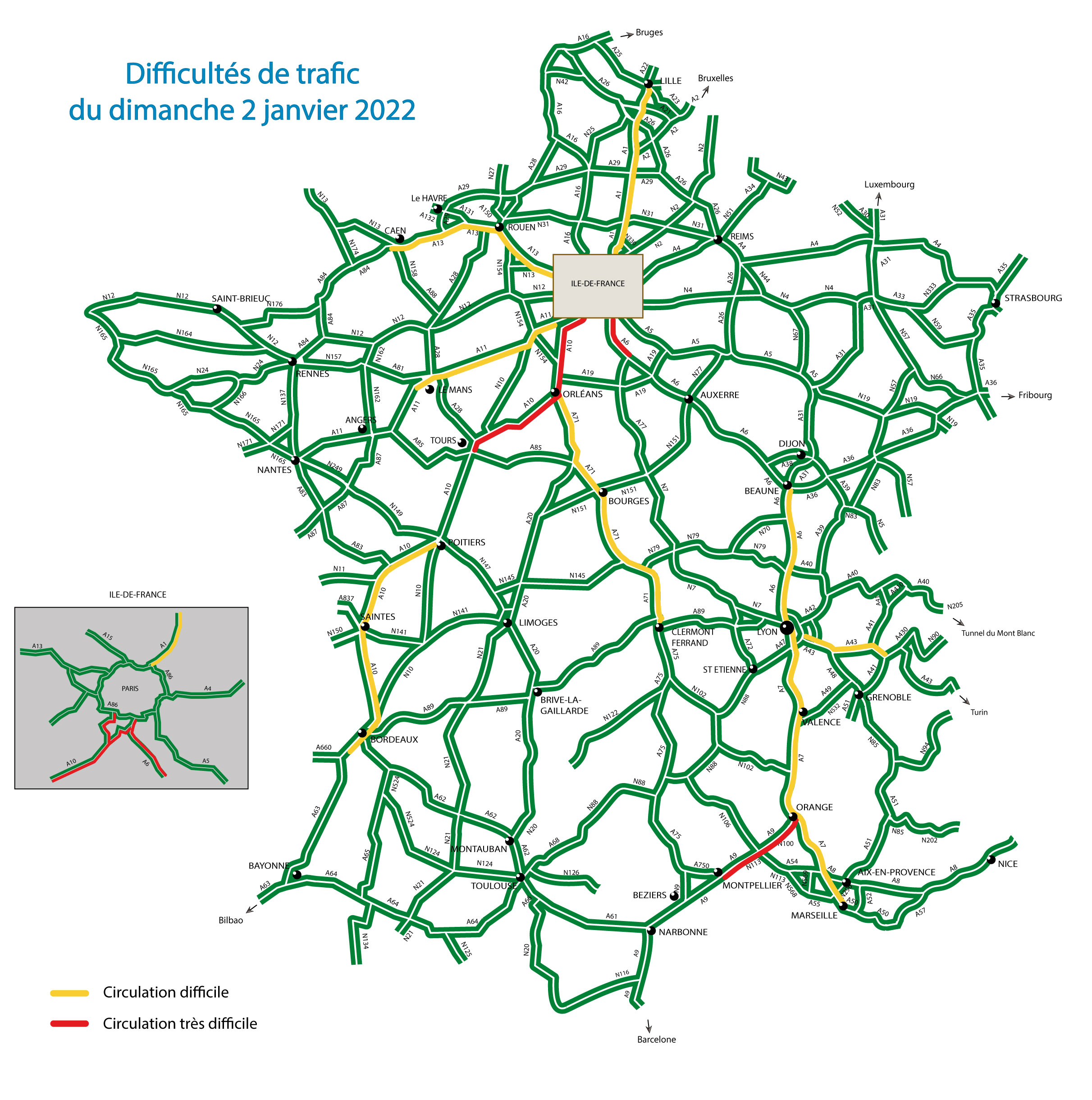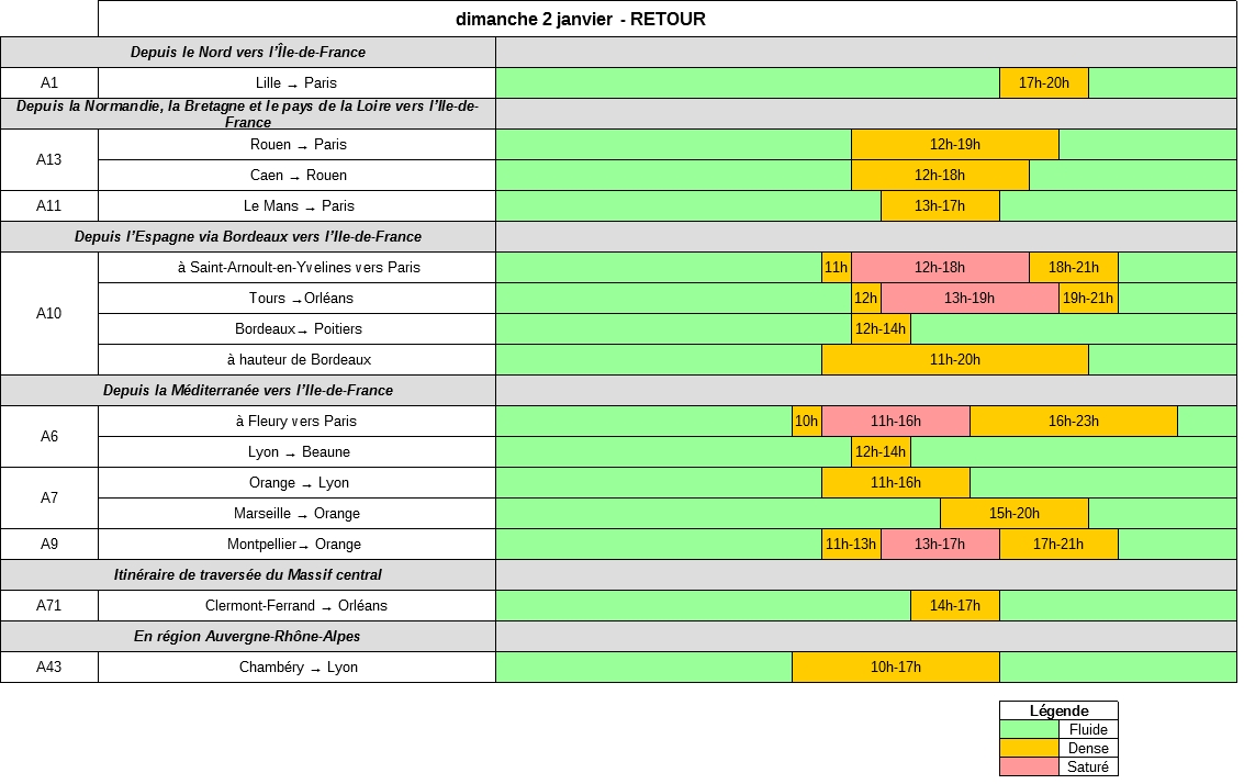 Dimanche 2 janvier, fin des vacances scolaires, est classé ORANGE dans le sens des retours. La circulation sera dense dans l’après-midi pour les derniers retours des vacances vers les grandes métropoles.