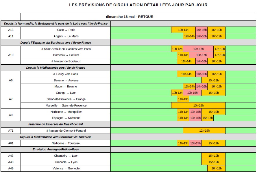Dimanche 16 mai, est classé rouge dans le sens des retours. La circulation sera très difficile au niveau national. En particulier, la circulation sera très dense sur les autoroutes A10, A6 et A13 en direction de l’Île-de-France, dès le milieu de la matinée et jusqu’en fin d’après-midi. Les temps de passages aux barrières de péage devraient être relativement importants.