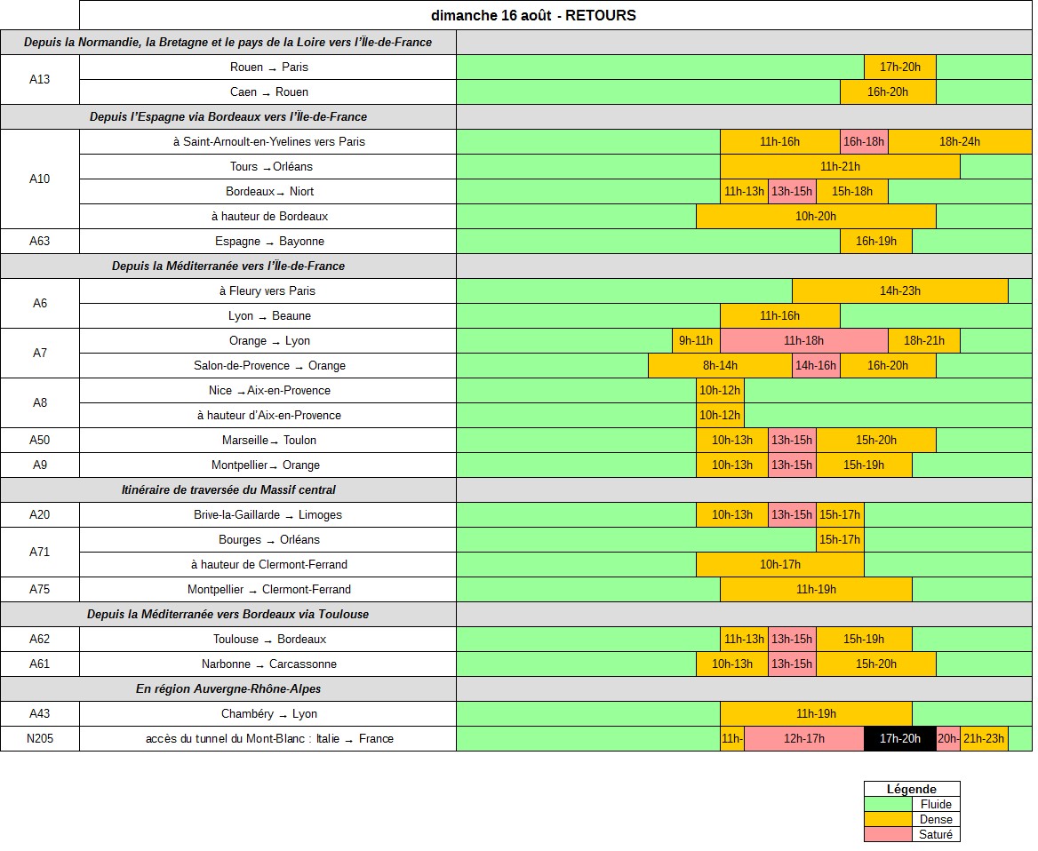 - le retour en France par le tunnel du Mont-Blanc (N205) sera chargé de 11h à 12h ety de 21h à 23h (attente supérieure à 30 min), très chargé de 12h à 17h et de 20h à 21h (attente supérieure à 1 h) et trafic critique entre 17h et 20h (attente supérieure à 2h).