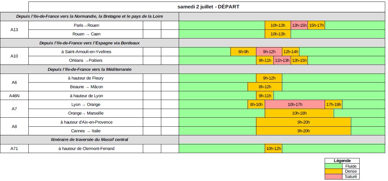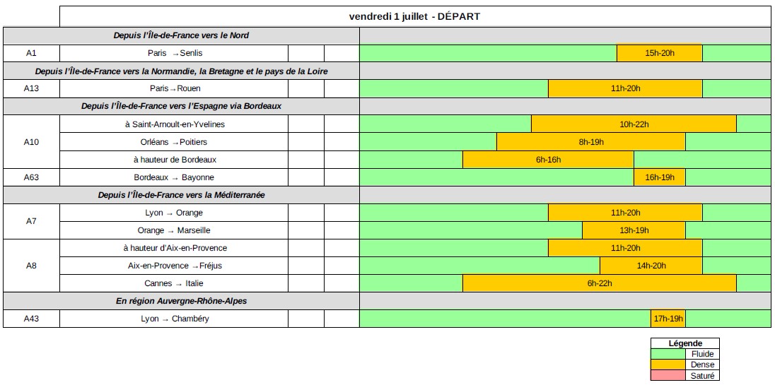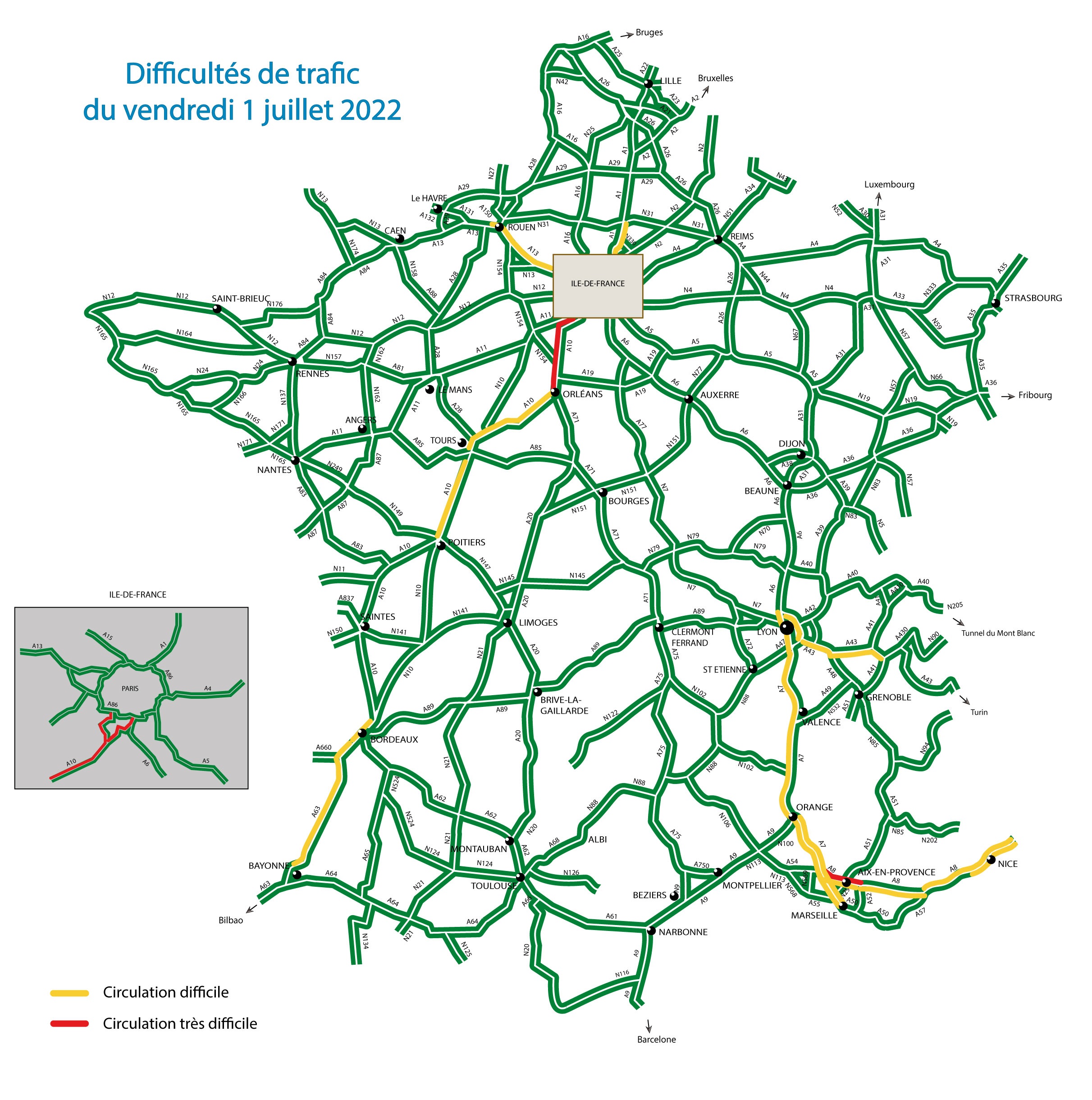 Cette période, située en dehors des congés scolaires en France, est concernée par d’importants flux migratoires sur les grands axes du pays. Il s’agit principalement de Français, non soumis aux obligations scolaires, qui prennent leurs vacances dès le début de l’été pour profiter d’une moindre fréquentation mais également de touristes étrangers, en particulier en provenance de la Belgique pour qui les vacances commencent ce week-end. En île-de-France, vendredi 1er juillet, la circulation sera dense en direction des barrières de péage des autoroutes A10 et A6, où les premiers ralentissements pourraient y être enregistrés dès la fin de matinée. Le Boulevard Périphérique et les autoroutes A86 et A6b seront également concernés par ces difficultés. En milieu d’après-midi, la conjugaison des trajets travail-domicile et les départs en week-end, nombreux pendant cette période, pourraient rendre la circulation très difficile jusque tard dans la soirée.