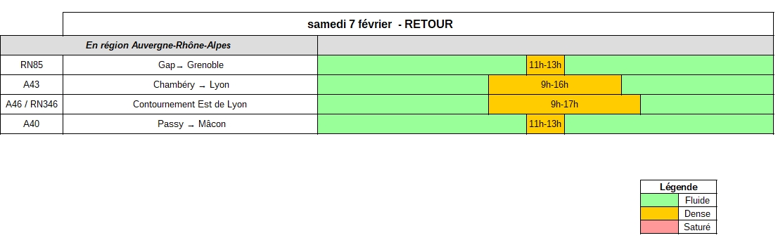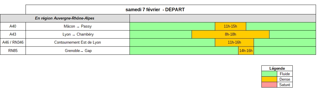 Samedi 7 février, dans les deux sens de circulation, les axes desservant la région Auvergne-Rhône-Alpes seront très sollicités, du début de la matinée jusqu’en fin d’après-midi. En particulier, des difficultés sont attendues sur les autoroutes A40, A43, A46 (contournement Est de Lyon), et sur la route nationale 85.