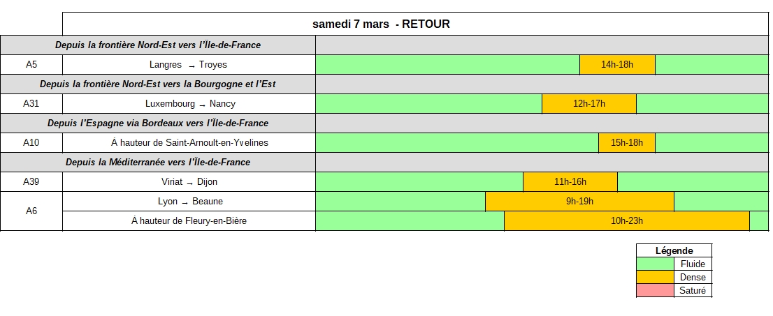 Dans le sens des retours, les routes du quart Nord-Est devraient concentrer les principales difficultés (A5, A31, A39) ainsi que l’autoroute A6, du milieu de la matinée et jusqu’en fin d’après-midi. En Île-de-France, la circulation sera dense sur l’autoroute A6, entre le milieu de matinée et jusque tard dans la soirée