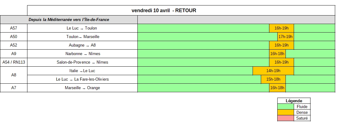 Vendredi 10 avril, dans le sens des retours, les principales congestions de la journée devraient se concentrer sur les axes desservant la façade méditerranéenne. Les autoroutes A7, A8, A9, A50, A52, A54 et A57 devraient être très sollicitées entre le milieu et la fin de l’après-midi.
