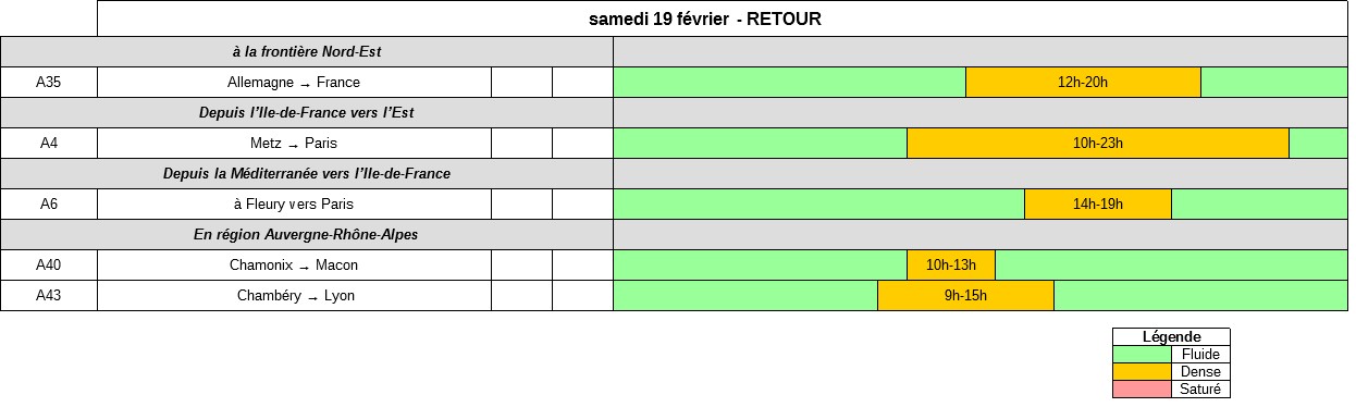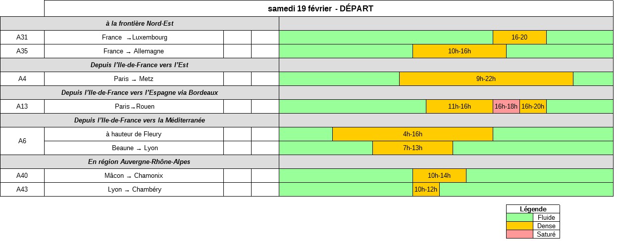 Les déplacements de ce week-end concerneront toutes les zones scolaires. Ce sera le début des vacances scolaires pour la zone C (Académies de Créteil, Montpellier, Paris, Toulouse, Versailles), la deuxième semaine pour la zone A (Académies de Besançon, Bordeaux, Clermont-Ferrand, Dijon, Grenoble, Limoges, Lyon, Poitiers) et la fin pour la zone B (Académies d’Aix-Marseille, Amiens, Caen, Lille, Nancy-Metz, Nantes, Nice, Orléans-Tours, Reims, Rennes, Rouen et Strasbourg). Ce week-end marque également le début des vacances scolaires aux Pays-Bas pour la zone nord et la fin de celles du Luxembourg. Ainsi, dans le sens des départs, la circulation sera dense entre les frontières du nord et les stations de sports d’hiver des Alpes.