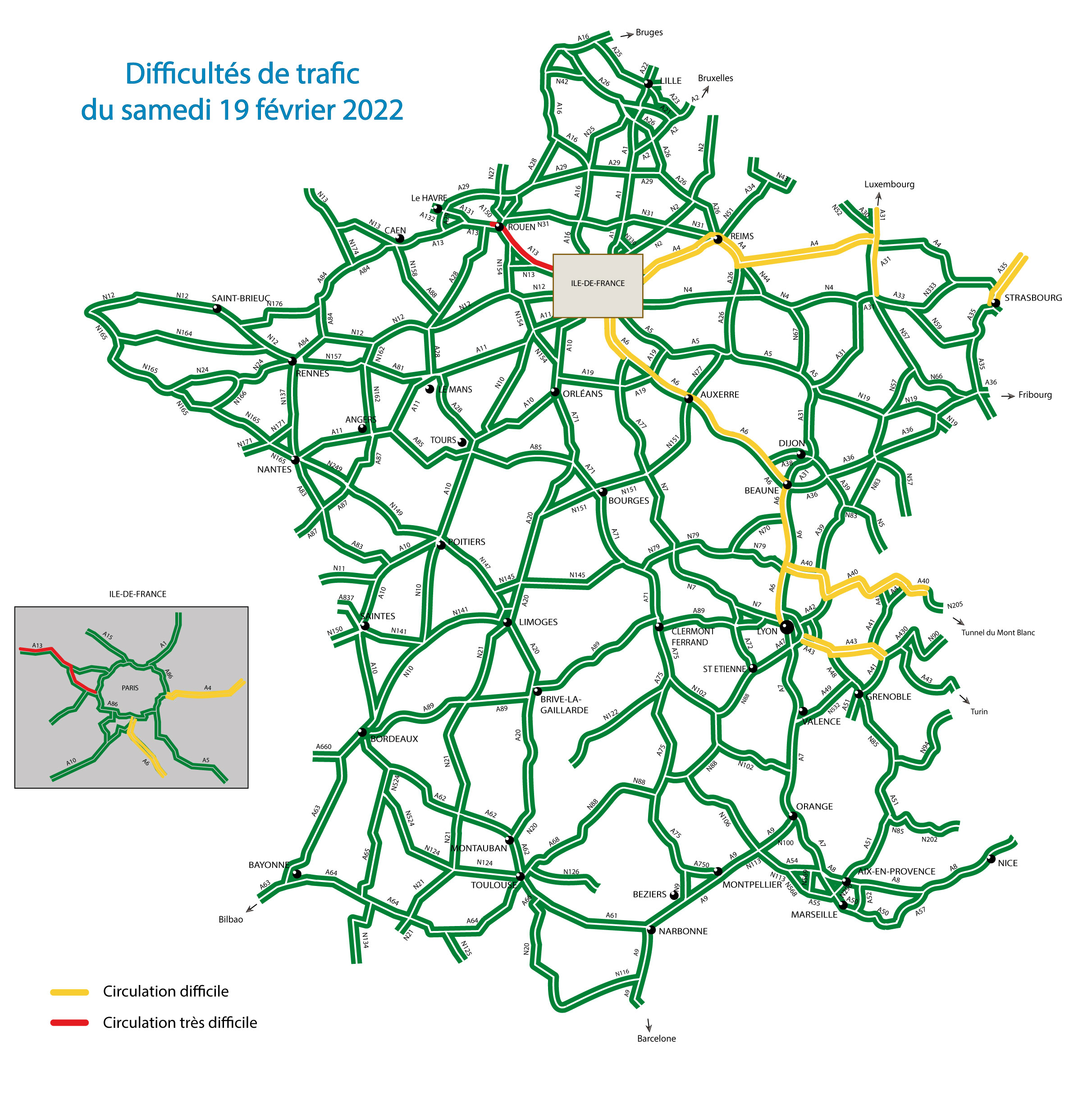 Vendredi 18 février, les premiers ralentissements pourront apparaître en Île-de-France dès la fin de matinée sur l’autoroute A6 entre Wissous et Chilly-Mazarin. Ils se transformeront progressivement en difficultés de circulation dès le début de l’après-midi, essentiellement sur les autoroutes A6A, A6B, A86 et A6. En milieu d’après-midi, les flux de trafic correspondant aux trajets travail-domicile et les départs en week-end renforceront ces difficultés. La pointe de trafic devrait être atteinte vers la fin de l’après-midi. La circulation restera dense sur l’A6 jusqu’en fin de soirée.