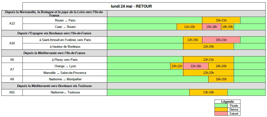 Lundi 24 mai, les retours sont prévus majoritairement l’après-midi. L’autoroute A13, la vallée du Rhône et l’Île-de-France devraient concentrer la majorité des encombrements.