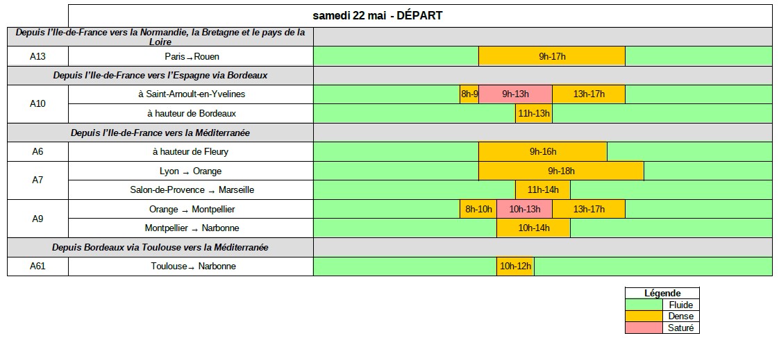 Samedi 22 mai, le trafic sera dense dans la matinée et jusqu’au milieu de l’après-midi.