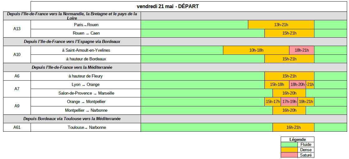 Vendredi 21 mai, les difficultés devraient débuter dès le début de l’après-midi et devraient être particulièrement importante en Île-de-France, dans la vallée du Rhône et aux abords des grandes agglomérations, notamment Bordeaux et Toulouse.