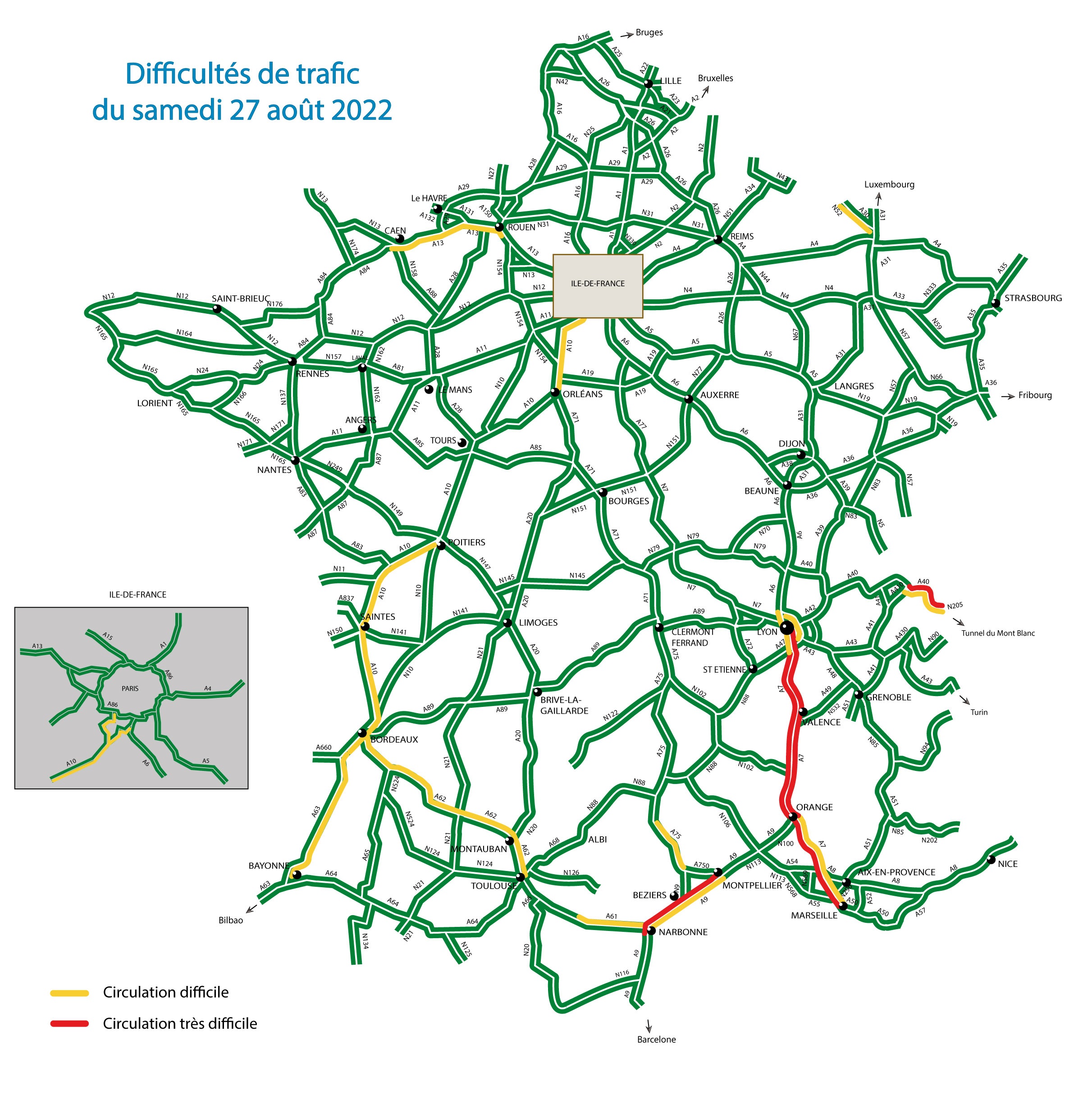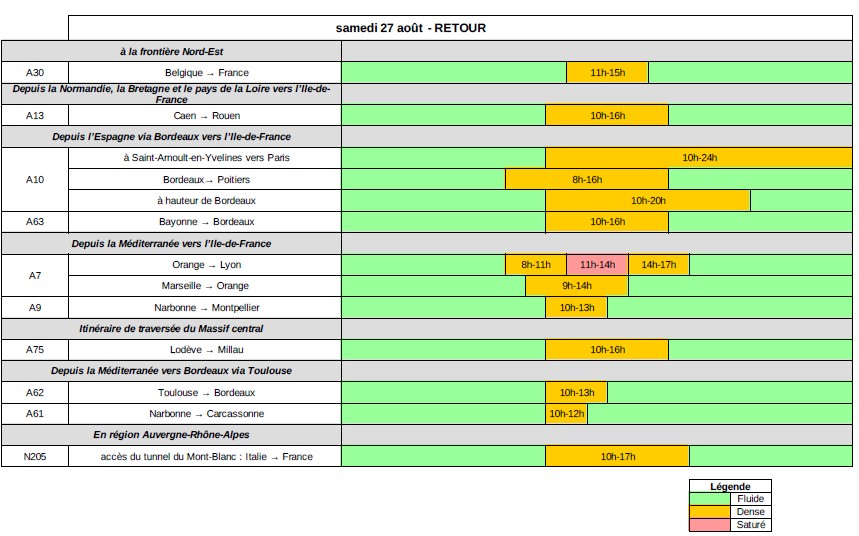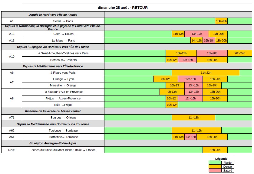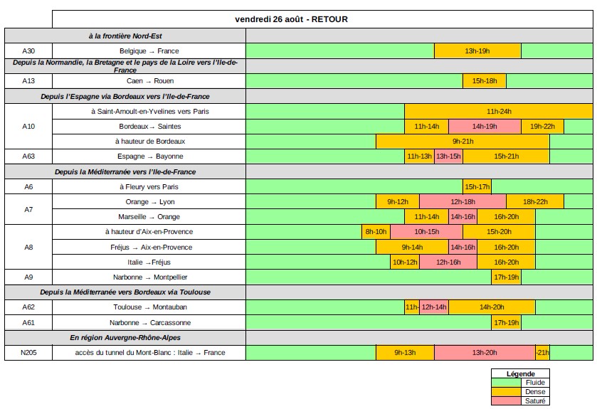 Ce week-end marquera la fin des congés scolaires. Les congés scolaires se terminent et l’essentiel des flux routiers concerne les retours des régions côtières vers les grandes métropoles. Durant toute la période, dans le sens des retours, la circulation sera difficile au niveau national. Vendredi 26 et samedi 27, sont classés rouge au niveau national dans le sens des retours. Les principales difficultés sont attendues à partir de 10h et se poursuivront jusqu’en début de soirée principalement sur les autoroutes A7 et A8 dans la vallée du Rhône et sur l’Arc méditerranéen et sur l’ A10 de Bordeaux vers Paris. Dimanche 28, dans le sens des retours, la circulation sera très difficile en région Auvergne-Rhône-Alpes notamment sur les autoroutes A7 et A8. Lundi 29 août, en Île-de-France, les ralentissements sont attendus dès le début de l’après-midi sur l’autoroute A10 entre la barrière de péage de Saint-Arnoult et la commune de Wissous et dans un second temps sur l’A6 entre Corbeil et Wissous. La conjugaison des retours de vacances et les trajets travail-domicile rendra la circulation difficile sur les radiales aux portes de Paris et sur les rocades (A86 et BP) qui permettent de rejoindre les autoroutes A3 et A1 en direction du Nord. En région Auvergne-Rhône-Alpes, la circulation sera très dense principalement sur l’autoroute A7.