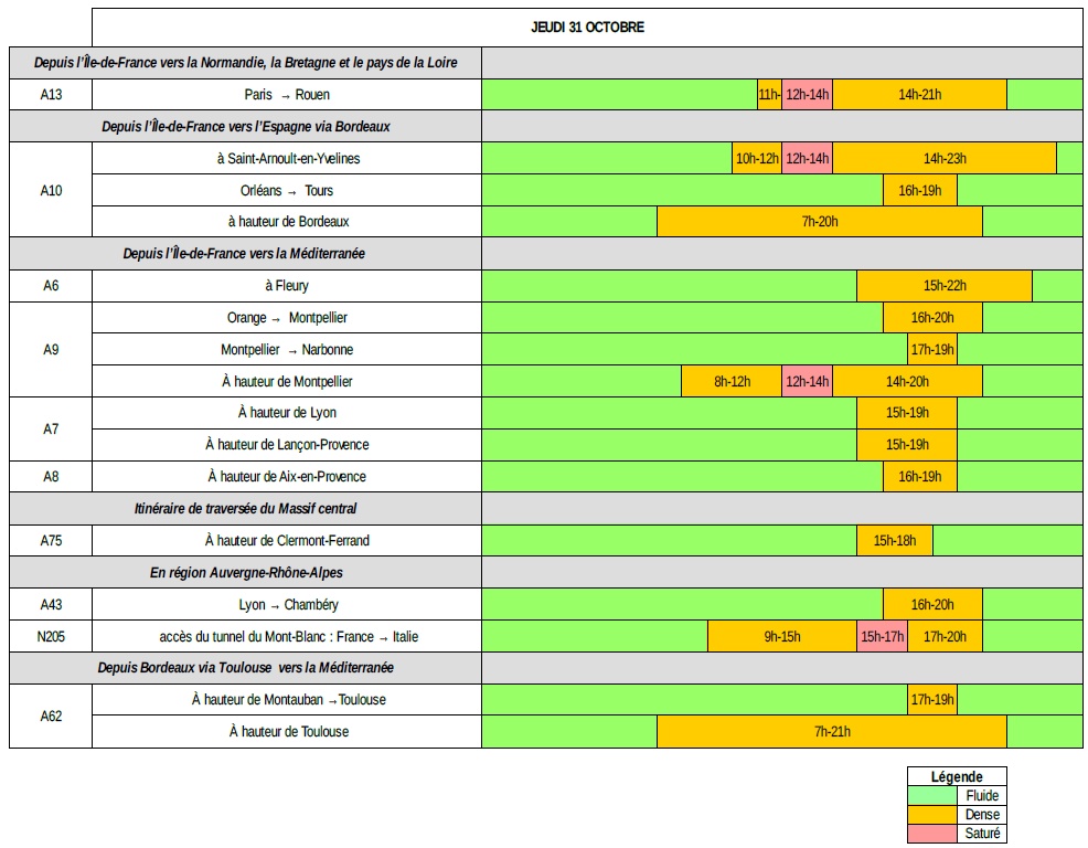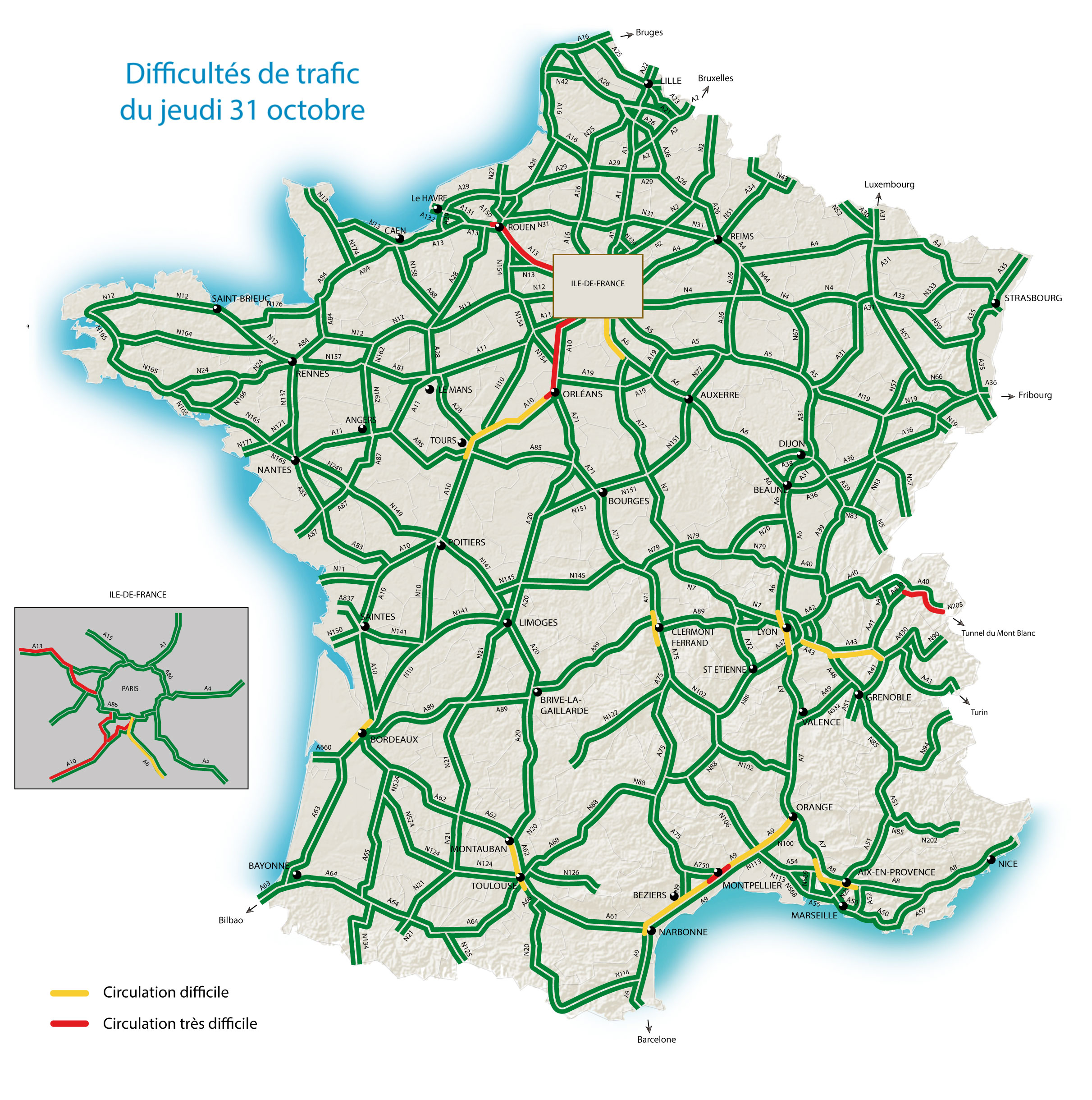 Jeudi 31 octobre, en milieu urbain, après une matinée plutôt calme, les bouchons récurrents seront présents l’après-midi. Ils seront accentués par les départs en week-end. Les difficultés devraient se prolonger en soirée notamment en Île-de-France. En dehors des sorties d’agglomérations, les difficultés de circulation devraient se limiter à des ralentissements épars qui ne causeront pas de gêne importante.