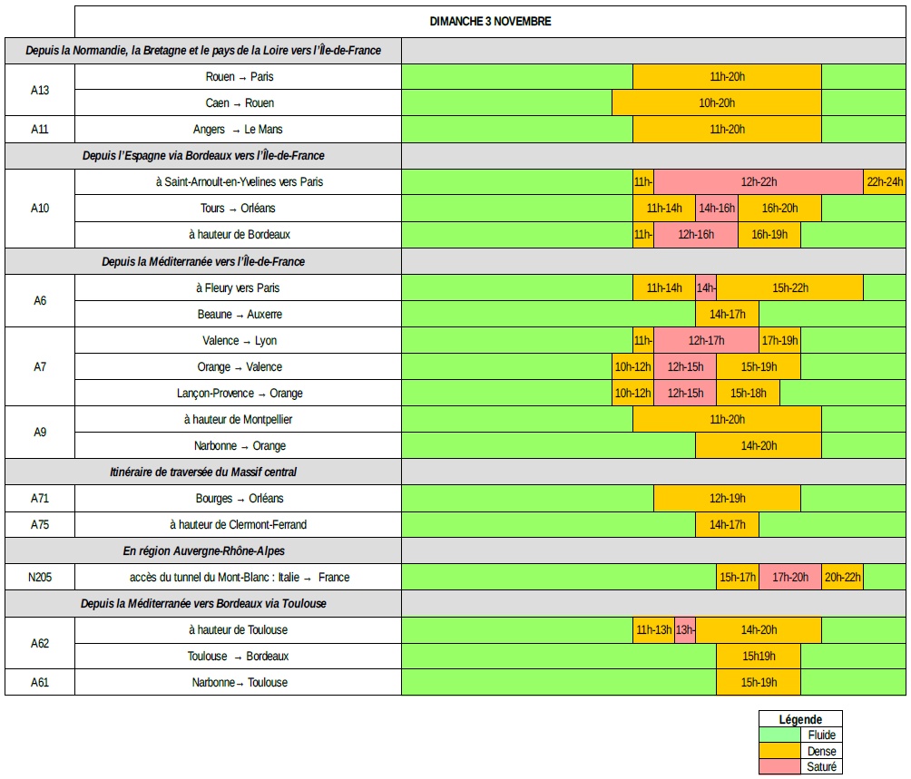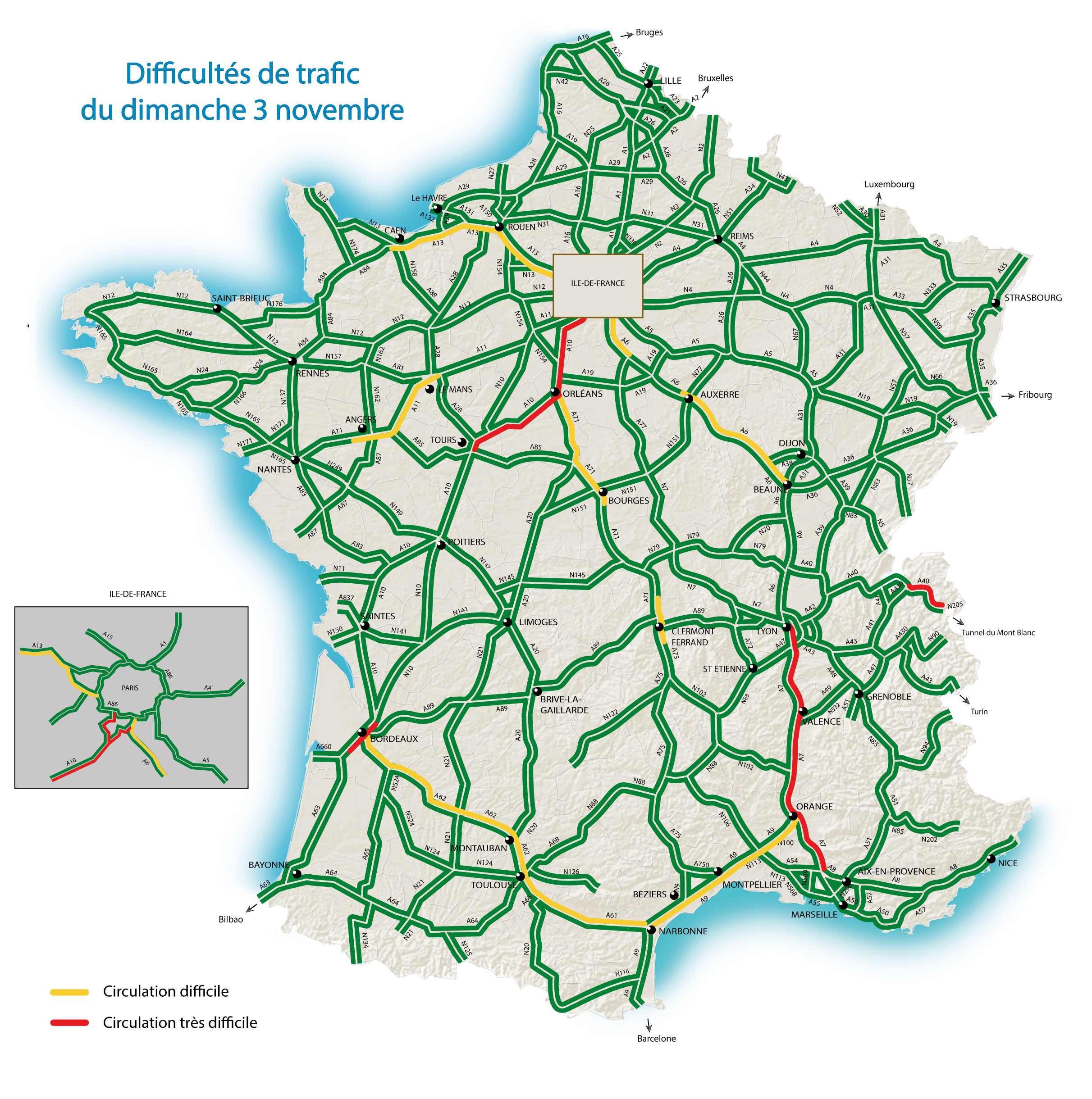 Dimanche 3 novembre, d’importantes difficultés sont attendues sur les axes convergeant vers les grandes agglomérations. Les axes de liaison entre la Normandie ou la Bretagne et l’Île-de-France ainsi que les axes A6, A10, N118 en direction de Paris devraient être particulièrement touchés par les phénomènes de congestion.