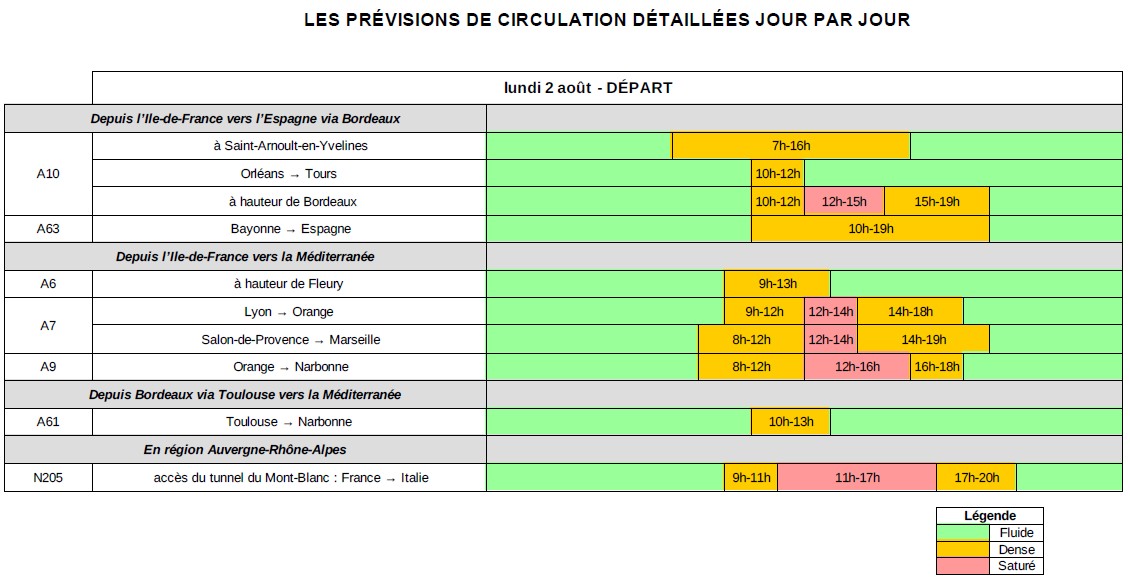 Samedi 31 juillet sera la journée classée Noir cet été. Il correspond au traditionnel chassé-croisé entre les « juilletistes » et les « aoûtiens ». Dans le sens des départs, la circulation sera « extrêmement difficile » sur la grande majorité des axes routiers et dans le sens des retours, la circulation sera très difficile plus particulièrement dans la région Auvergne-Rhône-Alpes et sur l’Arc méditerranéen. À noter que durant toute la période, dans le sens des départs, des difficultés de circulation sont attendues, notamment sur les autoroutes A6, A7, A8 et A9, dans le Sud-Est et sur l’Arc méditerranéen, sur l’A20, A61, A62 et A63 dans le Sud-Ouest. Des difficultés de circulation sont également attendues vers le Grand-Ouest, sur l’autoroute A10. Dans le sens des retours, la circulation sera dense et bien souvent difficile dans le Sud-Ouest sur les autoroutes A61 et A62, en Auvergne-Rhône-Alpes sur l’autoroute A7 et sur l’arc méditerranéen entre l’Italie et l’Espagne, que ce soit dans le sens Est-Ouest ou dans le sens Ouest-Est, sur les autoroutes A8, A7, A54, A9, sur la côte de la frontière italienne jusqu’à la frontière espagnole sur l’autoroute A9. Il est donc fortement déconseillé de rouler dans la nuit de vendredi au samedi, et durant toute la journée du samedi. Mieux vaudra attendre dimanche 1er août pour partir, tout en s’attendant à y rencontrer encore des bouchons, notamment en vallée du Rhône, sur l’autoroute A10 en région Centre et sur l’autoroute A13 en Normandie.