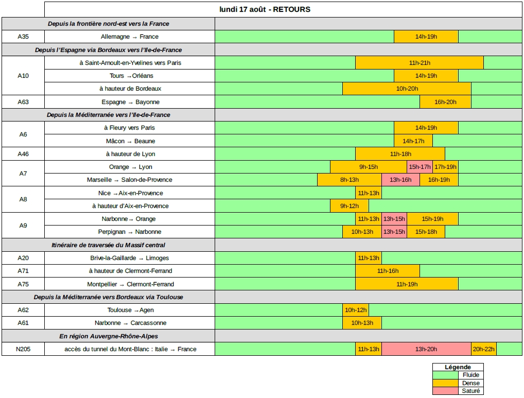 À noter que durant tout le week-end, dans le sens des retours, la circulation sera dense et bien souvent difficile sur l’arc méditerranéen entre l’Italie et l’Espagne, que ce soit en sens Est-Ouest ou en sens Ouest-Est sur les autoroutes A8, A7, A54, A9, sur la côte de la frontière italienne jusqu’à la frontière espagnole.