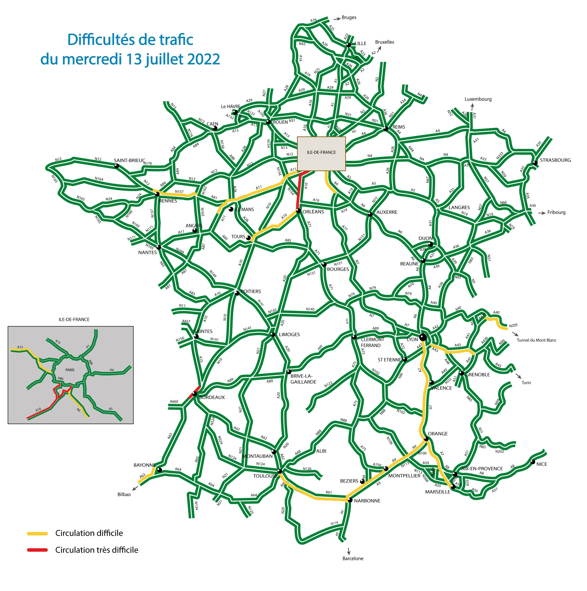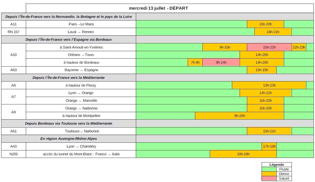 Mercredi 13 juillet, de nombreux bouchons sont attendus pour quitter les grandes métropoles. Les départs en week-end prolongé, les départs en vacances et les flux de véhicules en transit viennent s’ajouter à la circulation habituelle, déjà très difficile la veille d’un jour de fête. La circulation sera aussi difficile au niveau national dans le sens des départs dès le début de l’après-midi jusqu’en début de soirée.