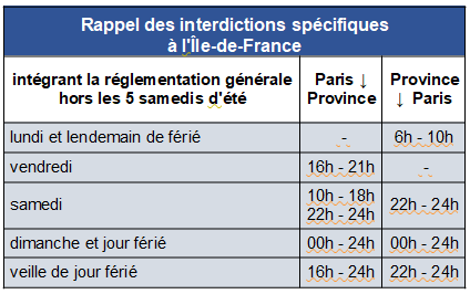 Sur certains axes d’Ile-de-France, des interdictions spécifiques viennent s’ajouter aux interdictions générales et complémentaires. Elles ne souffrent aucune dérogation.