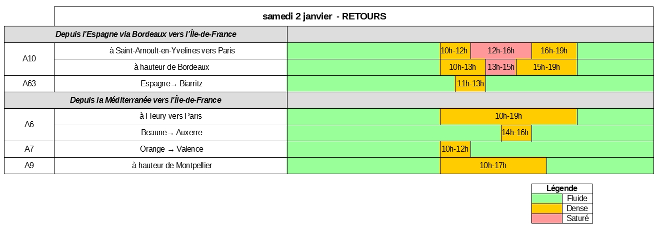 Durant cette période, la circulation ne devrait pas connaître de difficultés au niveau national. Seul samedi 2 janvier, fin des vacances scolaires, est classé ORANGE dans le sens des retours. La circulation sera dense dans l’après-midi pour les derniers retours des vacances vers les grandes métropoles, notamment Bordeaux, Montpellier et Lyon. En Île-de-France, on attend des ralentissements significatifs sur les axes convergeant vers Paris, principalement sur l’A6 et l’A10 à partir du milieu de la matinée jusqu’en début de soirée. Les conditions de circulation pourront se dégrader en fonction des conditions météorologiques. Les automobilistes sont donc invités à consulter l’état des routes sur le site internet Bison Futé (rubrique « Route en hiver »).