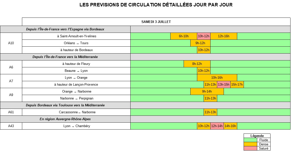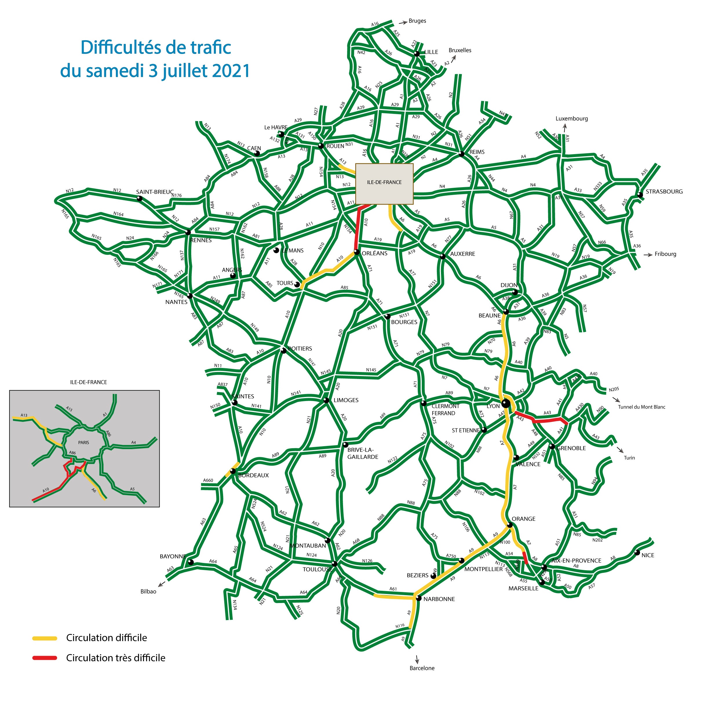 Cette période, située en dehors des congés scolaires en France, est concernée par d’importants flux migratoires sur les grands axes du pays. Il s’agit principalement de Français, non soumis aux obligations scolaires, qui prennent leurs vacances dès le début de l’été pour profiter d’une moindre fréquentation mais également de touristes étrangers, en particulier en provenance de la Belgique pour qui les vacances commencent ce week-end. En île-de-France, le vendredi 2 juillet, la circulation sera dense en direction des barrières de péage des autoroutes A10 et A6, où les premiers ralentissements pourraient y être enregistrés dès la fin de matinée. Le Boulevard Périphérique, les autoroutes A86 et A6b, seront également concernés par ces difficultés. En milieu d’après-midi, la conjugaison des trajets travail-domicile et les départs en week-end, nombreux pendant cette période, pourraient rendre la circulation très difficile jusque tard dans la soirée.