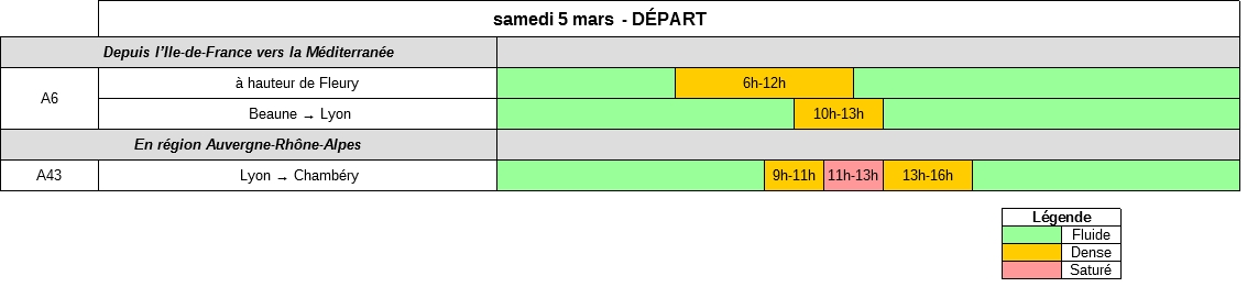 Samedi 9 mars, sur les axes de la région Auvergne-Rhône-Alpes (A43, A40, N90) le trafic sera dense en direction et au retour des stations de ski. En Île-de-France, dans le sens des retours, la circulation sera dense sur l’autoroute A6 où des difficultés de circulation sont attendues à partir de 11 heures et ce jusqu’en début de soirée.