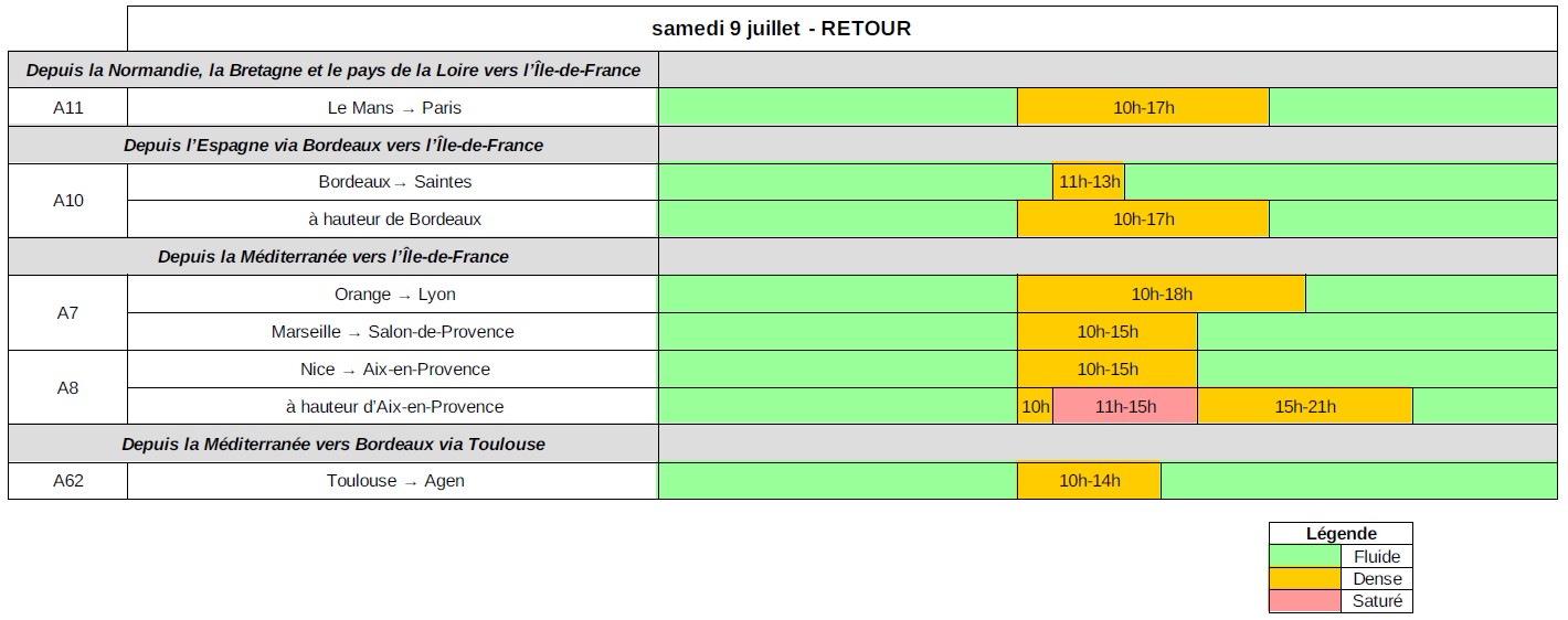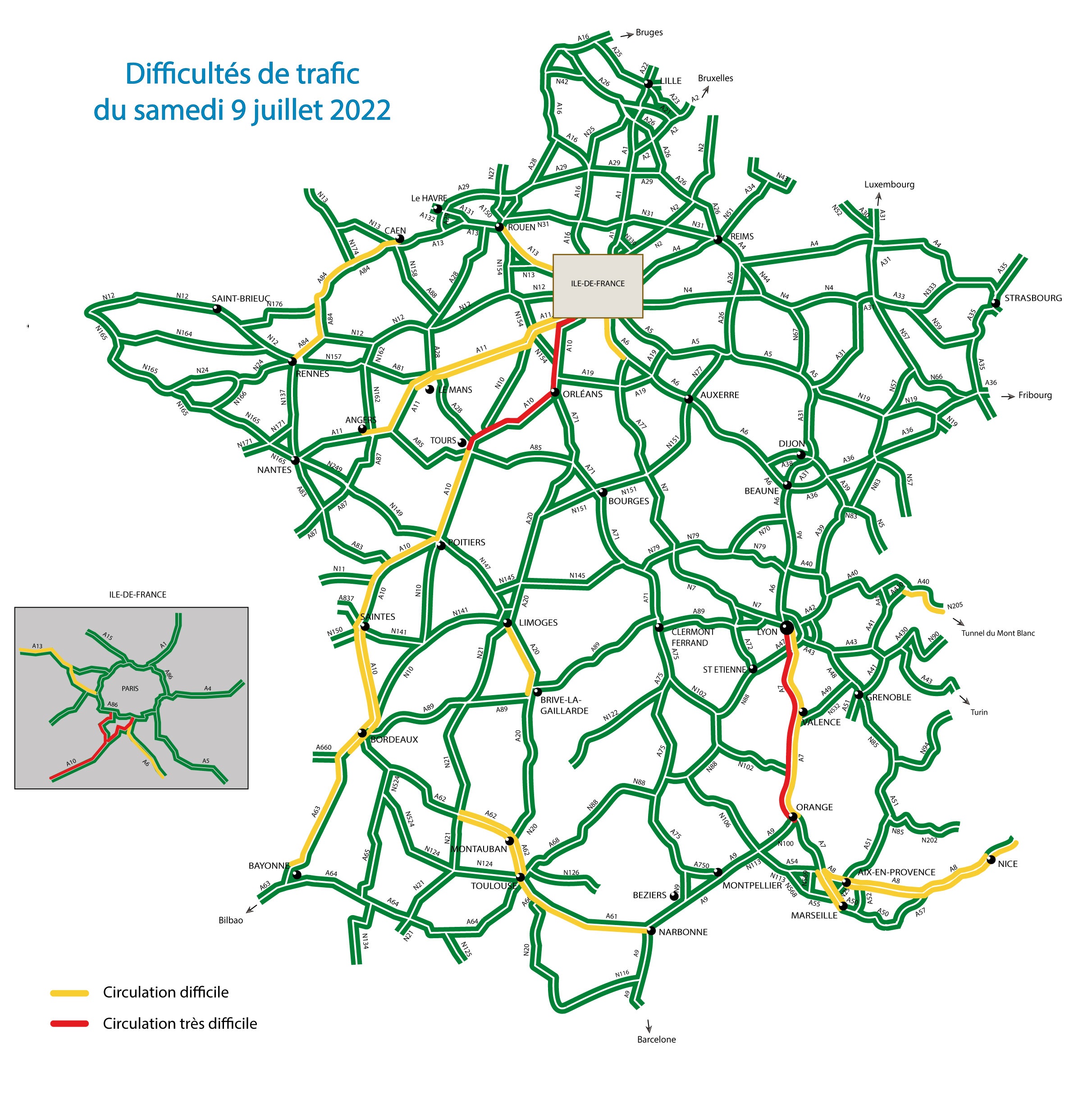 Vendredi 8 juillet, la circulation sera difficile sur l’ensemble des grands axes et très difficile en région Auvergne-Rhône-Alpes et en Île-de-France dans le sens des départs dès la fin de matinée. Les difficultés seront renforcées en milieu d’après-midi autour des grandes métropoles par les flux des trajets travail-domicile et les départs en week-end, nombreux en cette période. La circulation restera très dense dans le sens des départs jusque tard dans la soirée. Samedi 9 juillet, les difficultés dans le sens des départs seront les plus importantes du week-end sur l’ensemble du territoire et en particulier sur l’autoroute A7 dans la vallée du Rhône. En Île-de-France, la circulation sera très dense en direction des barrières de péages des autoroutes A6 et A10 dès le tout début de la matinée. L’autoroute A13 pourra également enregistrer des difficultés de circulation dès le milieu de la matinée. Ces difficultés pourraient se prolonger jusqu’en milieu d’après-midi. Dimanche 10 juillet, la situation sera plus calme sur l’ensemble du réseau routier. Des difficultés persisteront toutefois sur l’autoroute A7 dans la Vallée du Rhône dans le sens Nord-Sud.