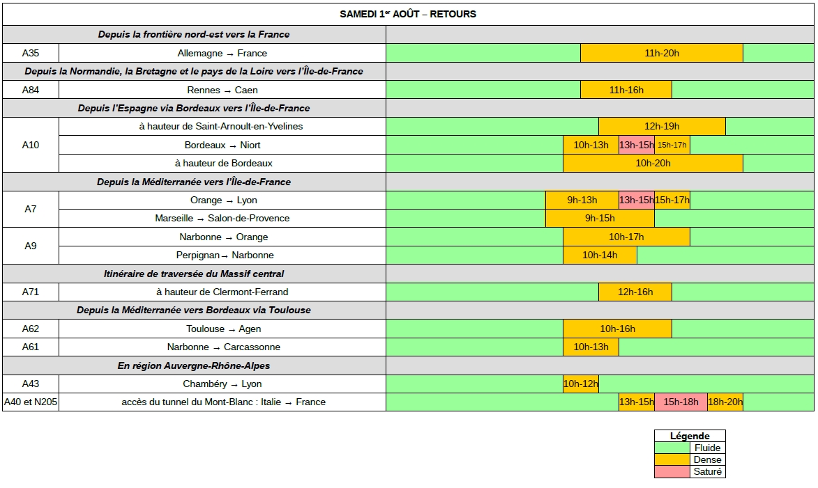 Le vendredi 31 juillet et le samedi 1er août, dans le sens des retours, la circulation sera dense et bien souvent difficile dans le Sud-Ouest sur les autoroutes A61 et A62, en Auvergne-Rhône-Alpes sur l’autoroute A7 et sur l’arc méditerranéen sur l’autoroute A9. Des difficultés particulières sont attendues sur l’A10 à hauteur de Bordeaux et le samedi entre Bordeaux et Niort.