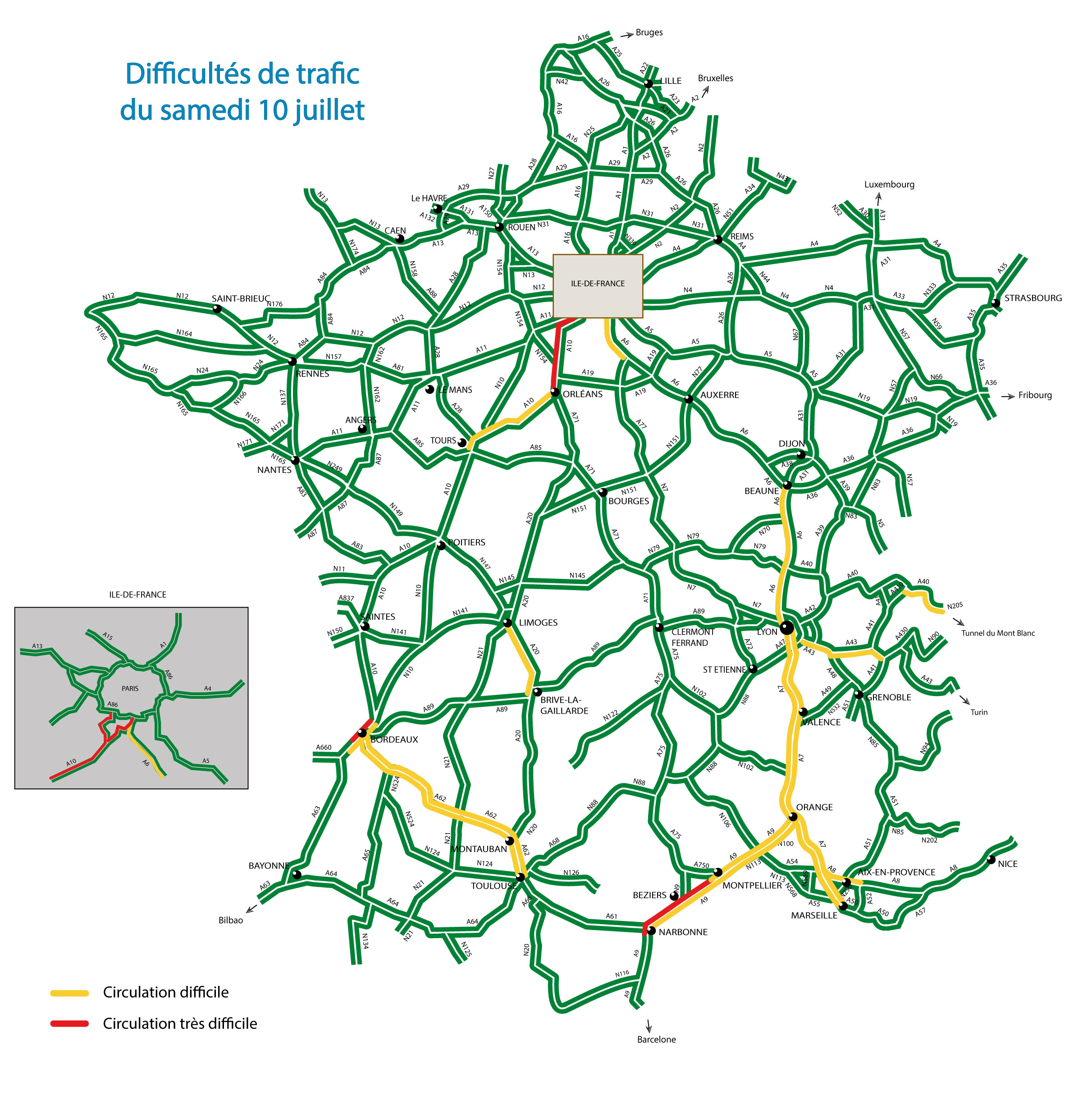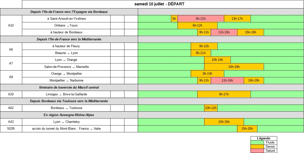 Samedi 10, la circulation sera très difficile sur l’ensemble du territoire dès le début de la matinée, notamment en Île-de-France en direction des barrières de péages des autoroutes A6 et A10. L’autoroute A13 pourra également enregistrer des difficultés de circulation vers la Normandie et la Bretagne. L’arc méditerranéen et, dans une moindre mesure, la vallée du Rhône connaîtront les difficultés habituelles liées aux premiers départs en vacances.