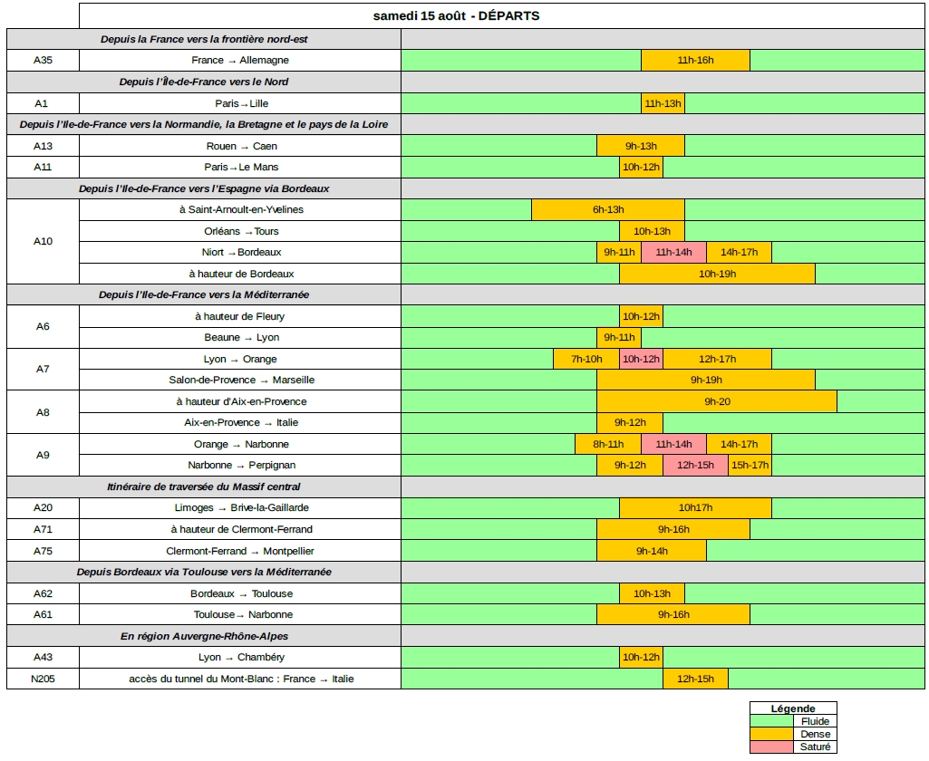 Samedi 15 août, dans le sens des départs, les difficultés de circulation sont attendues principalement dans la région Auvergne-Rhône-Alpes et sur l’Arc méditerranéen.