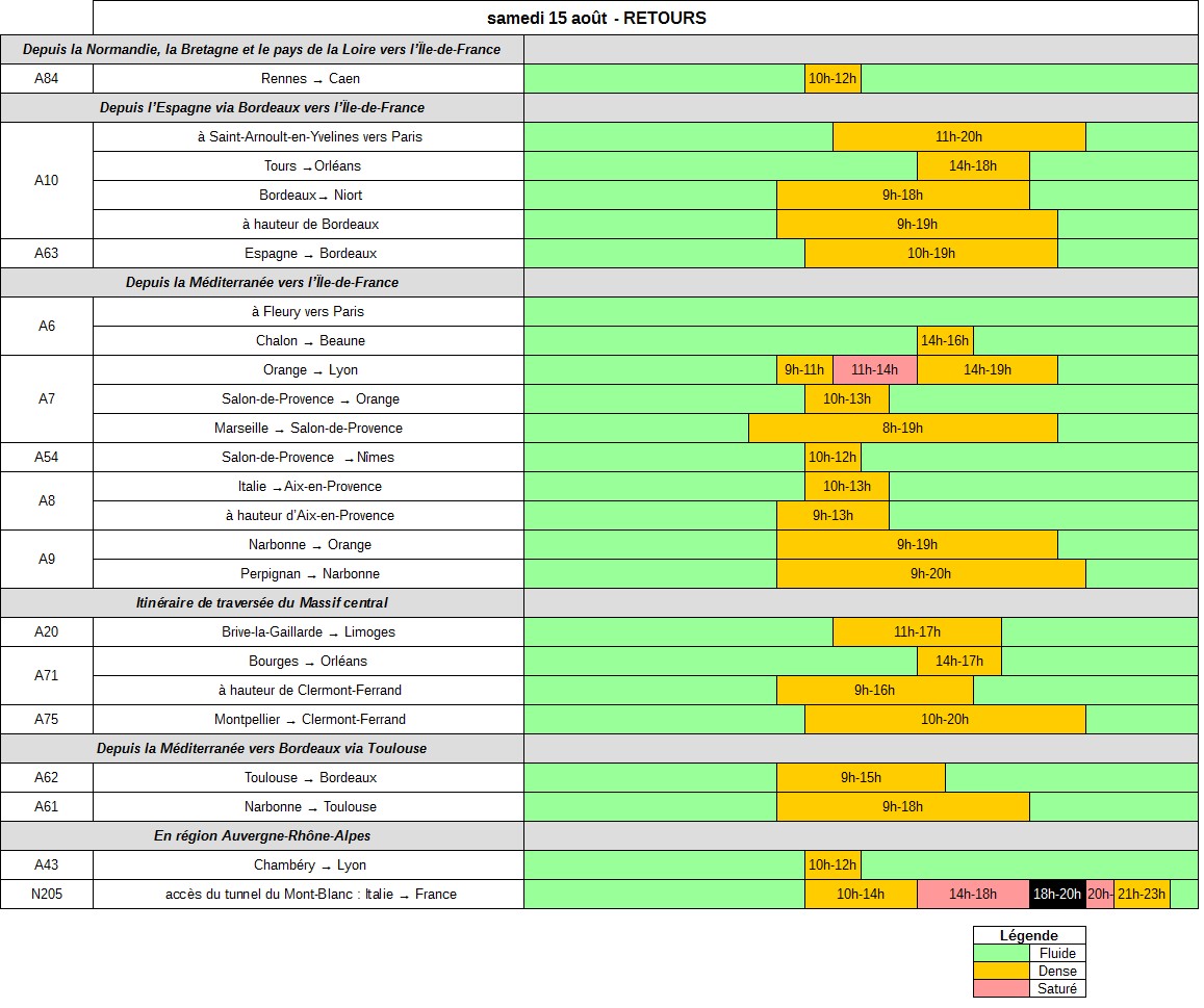 - le retour en France par le tunnel du Mont-Blanc (N205) sera chargé, de 10h à 14h et de 21h à 23h (attente supérieure à 30min) et très chargé de 14h à 18h et de 20h à 21h (attente supérieure à 1h) et trafic critique entre 18h et 20h (attente supérieure à 2h).