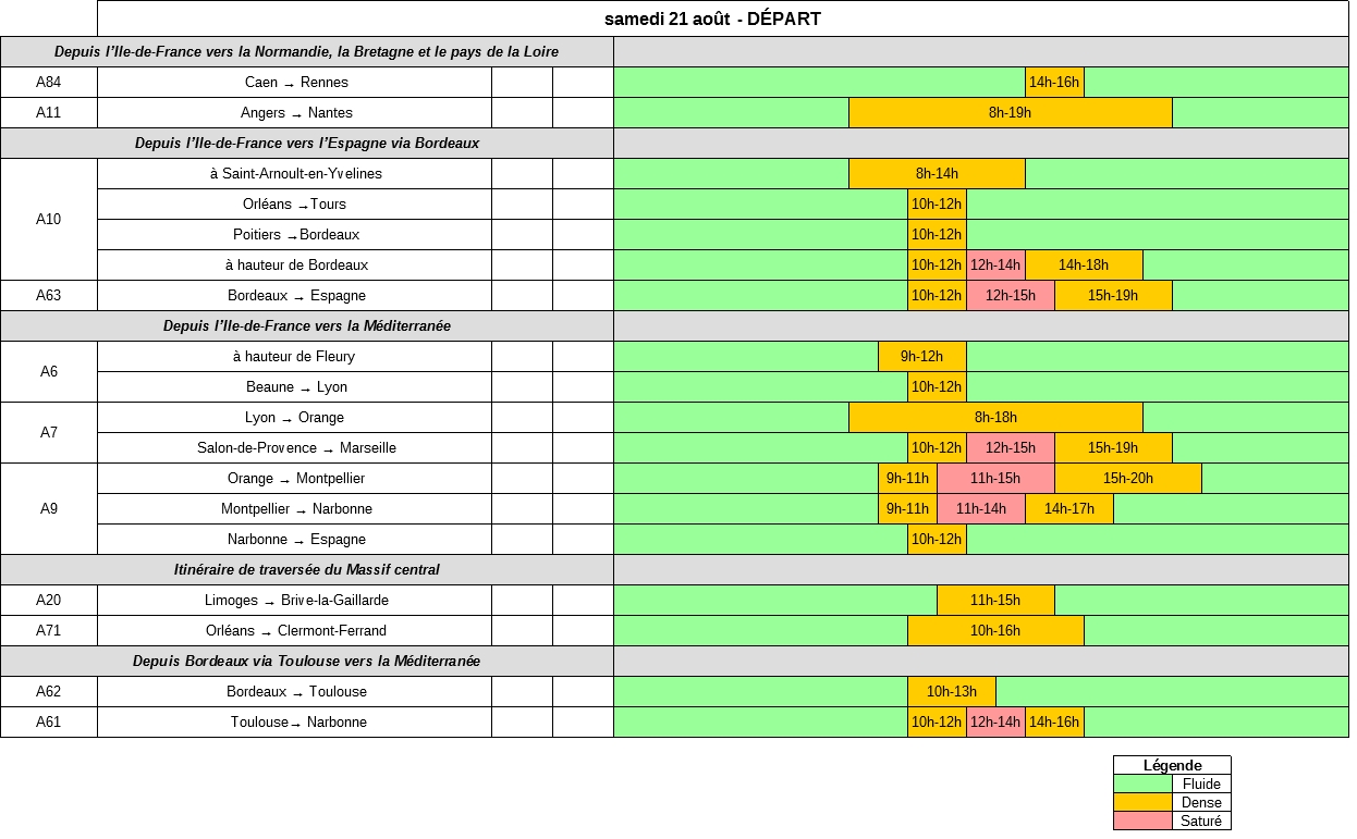 Samedi 21 août, la circulation sera difficile dans le sens des départs jusqu’en début d’après-midi. Les retours s’étaleront sur l’ensemble de la journée rendant la circulation très difficile voire extrêmement difficile dans le sud-Est du pays et notamment sur les autoroutes A7, A9, A71 et A62.