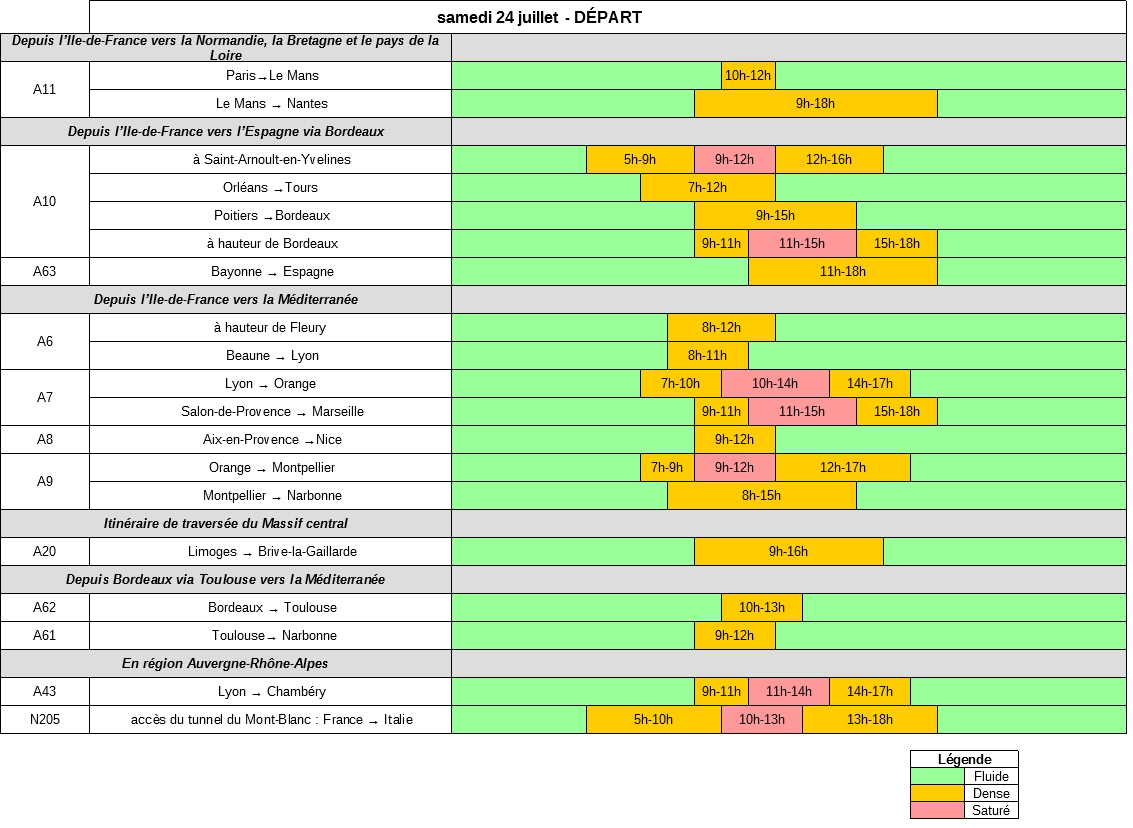 Samedi 24 juillet, les difficultés de circulation seront importantes sur l’ensemble des grands itinéraires du pays. Les départs en vacances débuteront assez tôt dans la matinée et se prolongeront jusqu’en fin d’après-midi. Des ralentissements et des bouchons sont attendus, en particulier dans la vallée du Rhône sur l’autoroute A7, sur les autoroutes A8 et A9 le long de la Méditerranée ainsi que sur l’autoroute A10 vers le Sud-Ouest. Dans le sens des retours, de nombreux déplacements sont attendus sur l’ensemble du pays mais les difficultés devraient rester modérées.