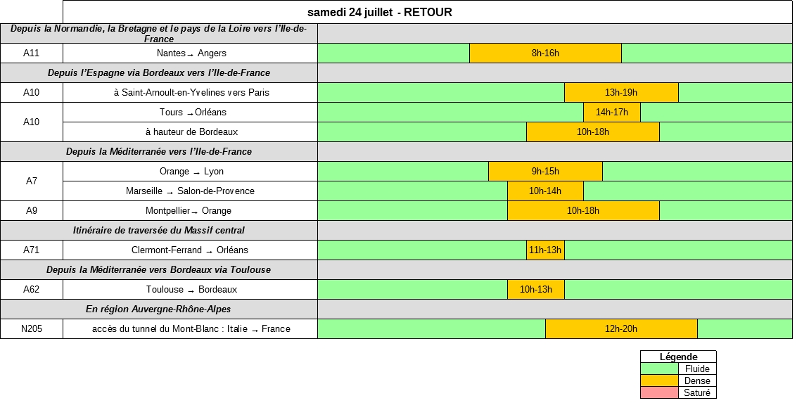 Samedi 24 juillet, les difficultés de circulation seront importantes sur l’ensemble des grands itinéraires du pays. Les départs en vacances débuteront assez tôt dans la matinée et se prolongeront jusqu’en fin d’après-midi. Des ralentissements et des bouchons sont attendus, en particulier dans la vallée du Rhône sur l’autoroute A7, sur les autoroutes A8 et A9 le long de la Méditerranée ainsi que sur l’autoroute A10 vers le Sud-Ouest. Dans le sens des retours, de nombreux déplacements sont attendus sur l’ensemble du pays mais les difficultés devraient rester modérées.
