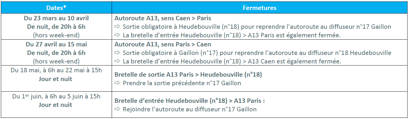 Pour permettre la mise en place de ce nouveau mode de circulation et adapter la signalisation en toute sécurité, SANEF programme des fermetures de l’A13 et du diffuseur d’Heudebouville (n°18), selon le calendrier suivant :