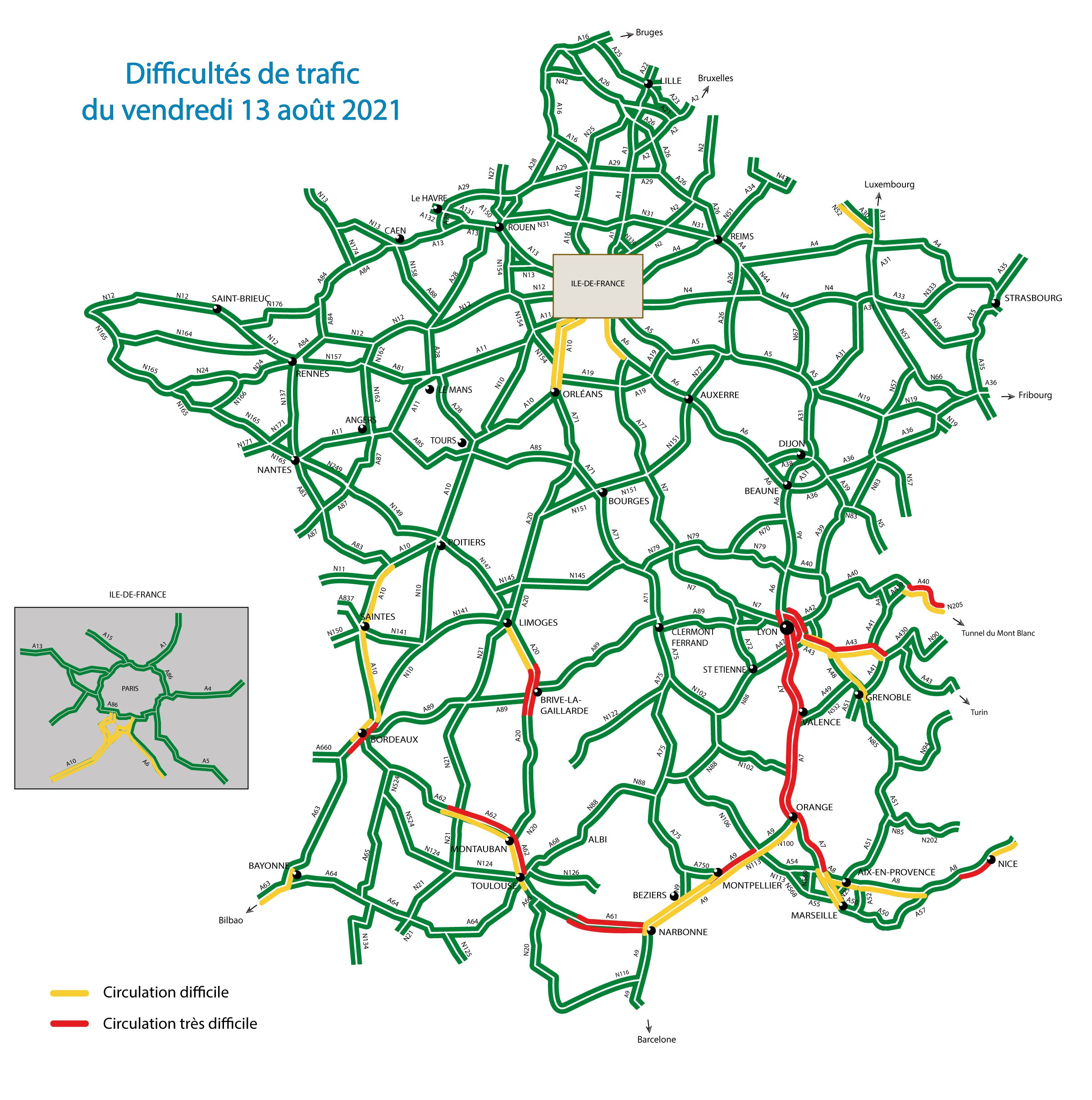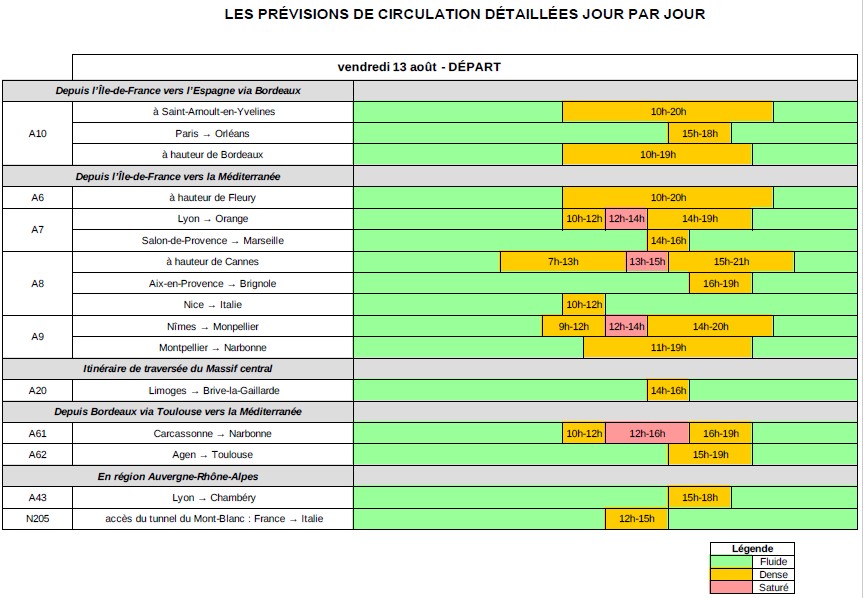 Les retours en direction du nord vont prendre le pas sur les départs vers les régions côtières. Les flux de circulation majoritaires se feront du sud du pays vers le nord. Samedi 14 août, dans le sens des départs les difficultés de circulation sont attendues principalement dans la région Sud-Ouest et sur l’Arc méditerranéen. À noter que durant tout le week-end, dans le sens des retours, la circulation sera dense et bien souvent très difficile sur l’Arc méditerranéen entre l’Italie et l’Espagne, que ce soit en sens Est-Ouest ou en sens Ouest-Est sur les autoroutes A7, A8 et A9, A61 et A62 sur la côte de la frontière italienne jusqu’à la frontière espagnole.
