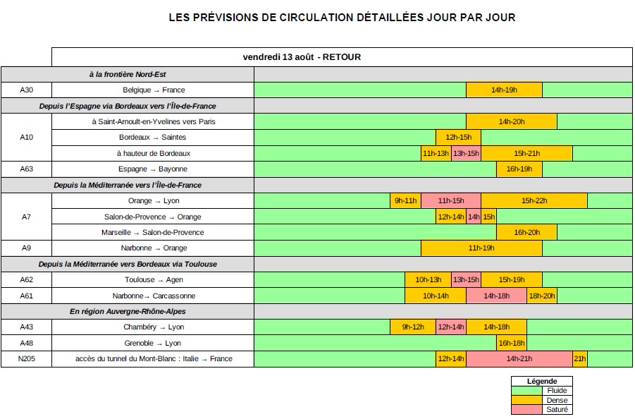 Les retours en direction du nord vont prendre le pas sur les départs vers les régions côtières. Les flux de circulation majoritaires se feront du sud du pays vers le nord. Samedi 14 août, dans le sens des départs les difficultés de circulation sont attendues principalement dans la région Sud-Ouest et sur l’Arc méditerranéen. À noter que durant tout le week-end, dans le sens des retours, la circulation sera dense et bien souvent très difficile sur l’Arc méditerranéen entre l’Italie et l’Espagne, que ce soit en sens Est-Ouest ou en sens Ouest-Est sur les autoroutes A7, A8 et A9, A61 et A62 sur la côte de la frontière italienne jusqu’à la frontière espagnole.