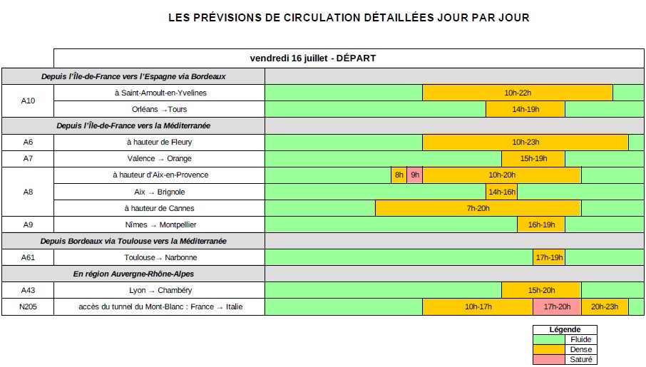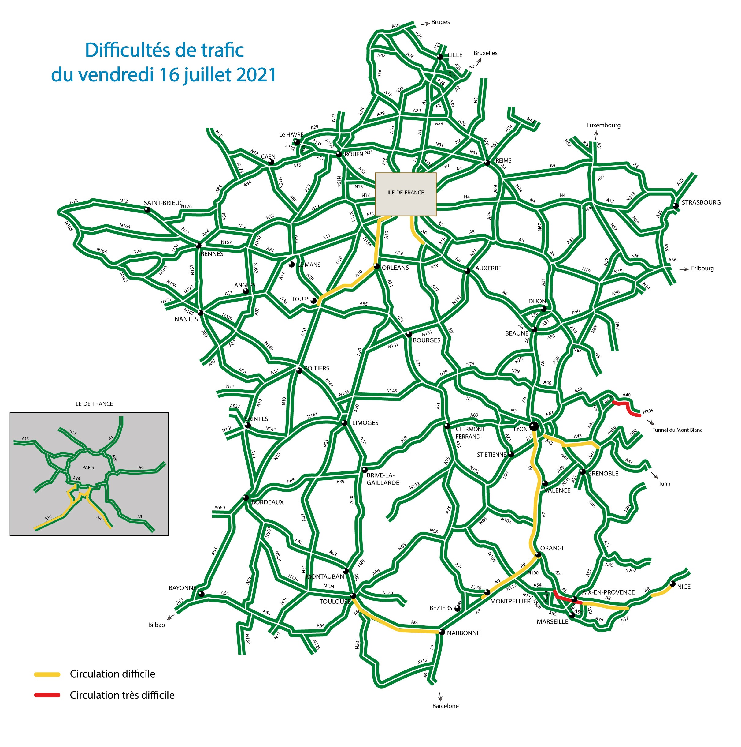 Vendredi 16 juillet, dans le sens des départs, d’importants flux de véhicules et des encombrements sur les grands axes autoroutiers sont attendus, plus particulièrement sur les autoroutes A7, A8 et A9 vers la Méditerranée. Des difficultés de circulation sont attendues dans les agglomérations entre 14h et 19h où les départs des vacanciers viendront s’ajouter aux déplacements habituels. En Île-de-France, les premiers ralentissements seront enregistrés dès la fin de matinée sur l’autoroute A6b et les rocades (Boulevard Périphérique et A86) qui convergent vers les autoroutes A6 et A10. Ces difficultés seront renforcées en milieu d’après-midi par les flux des trajets travail-domicile. La circulation restera très dense jusque tard dans la soirée. Sur l’autoroute A13 également, des difficultés de circulation pourraient être enregistrées dès le milieu d’après-midi et pourraient être encore présentes jusque tard dans la soirée.