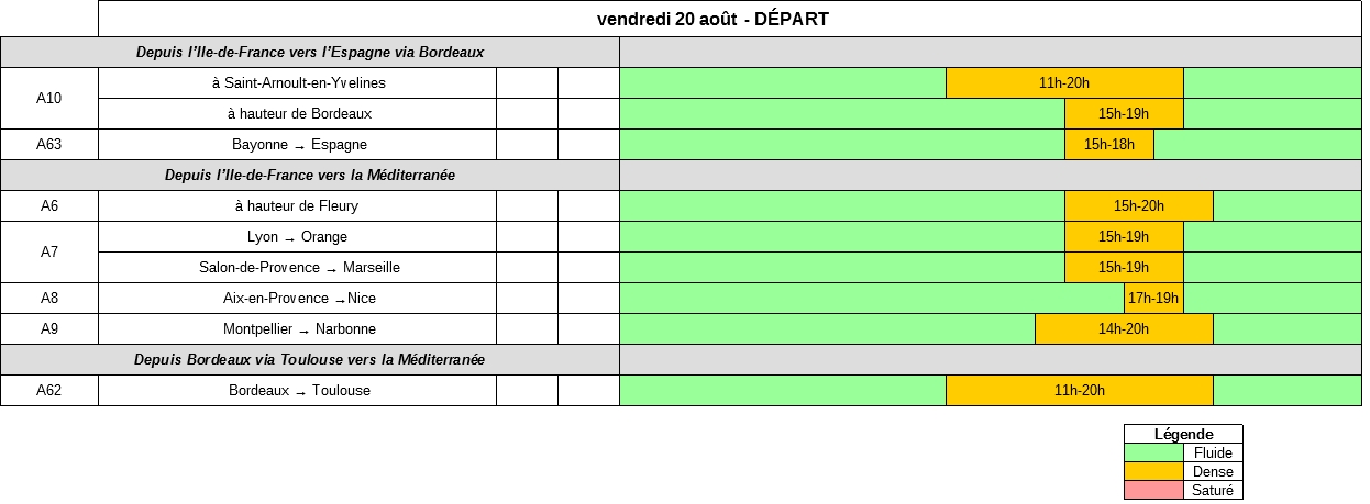 Vendredi 20 août, les retours devraient démarrer dès le début de la matinée depuis le Sud de la France et s’intensifieront à partir du tout début d’après-midi. Les difficultés devraient perdurer jusqu’en fin de soirée.