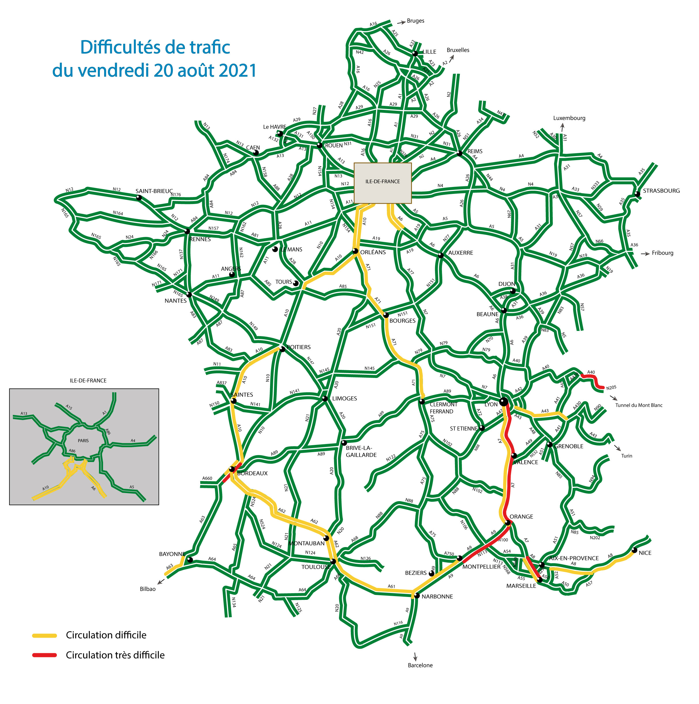 Samedi 21 août, la circulation sera difficile dans le sens des départs jusqu’en début d’après-midi. Les retours s’étaleront sur l’ensemble de la journée rendant la circulation très difficile voire extrêmement difficile dans le sud-Est du pays et notamment sur les autoroutes A7, A9, A71 et A62.