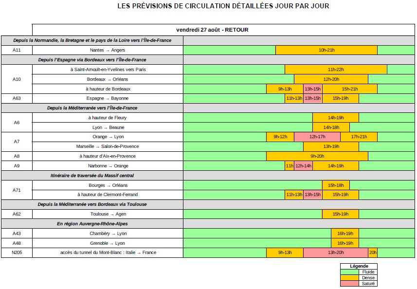 Samedi 28 août, les usagers devraient rencontrer encore des difficultés en direction du sud dans la traversée de Lyon, puis en vallée du Rhône sur l’autoroute A7 et enfin sur les axes du pourtour méditerranéen notamment sur l’autoroute A9. Dans le sens des retours, la couleur ROUGE est annoncée en région Auvergne-Rhône-Alpes et sur l’Arc méditerranéen, les difficultés sont attendues sur les autoroutes A6, A7, A8, A9 et A10.